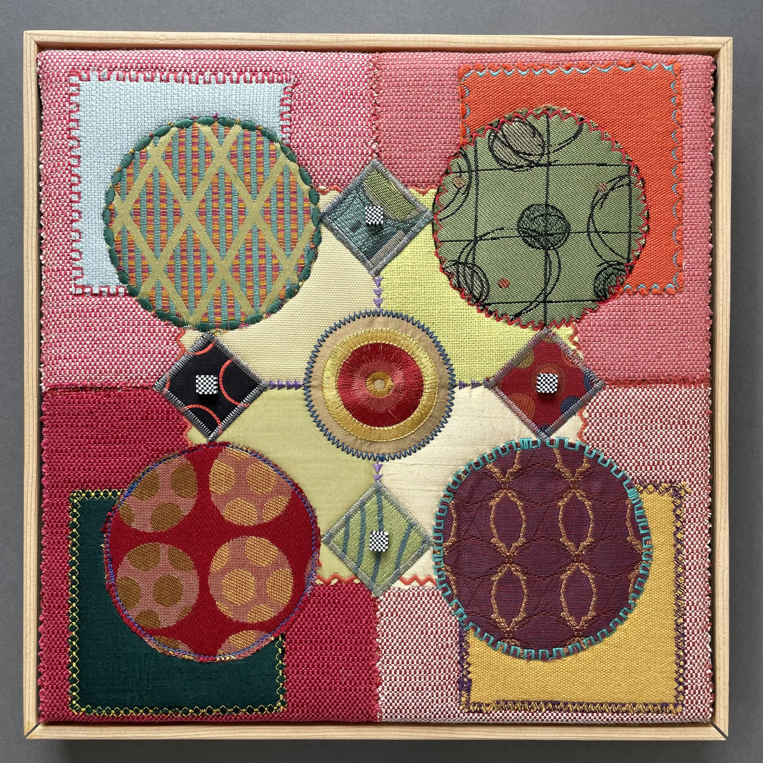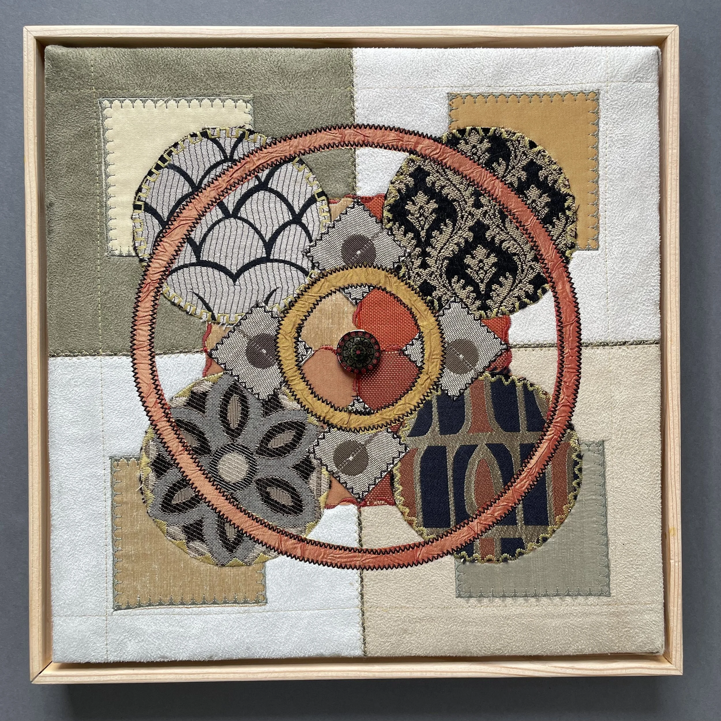 Breaking Out of Our Boxes, 12”X12”, machine stitched using designer fabric swatches. Sold