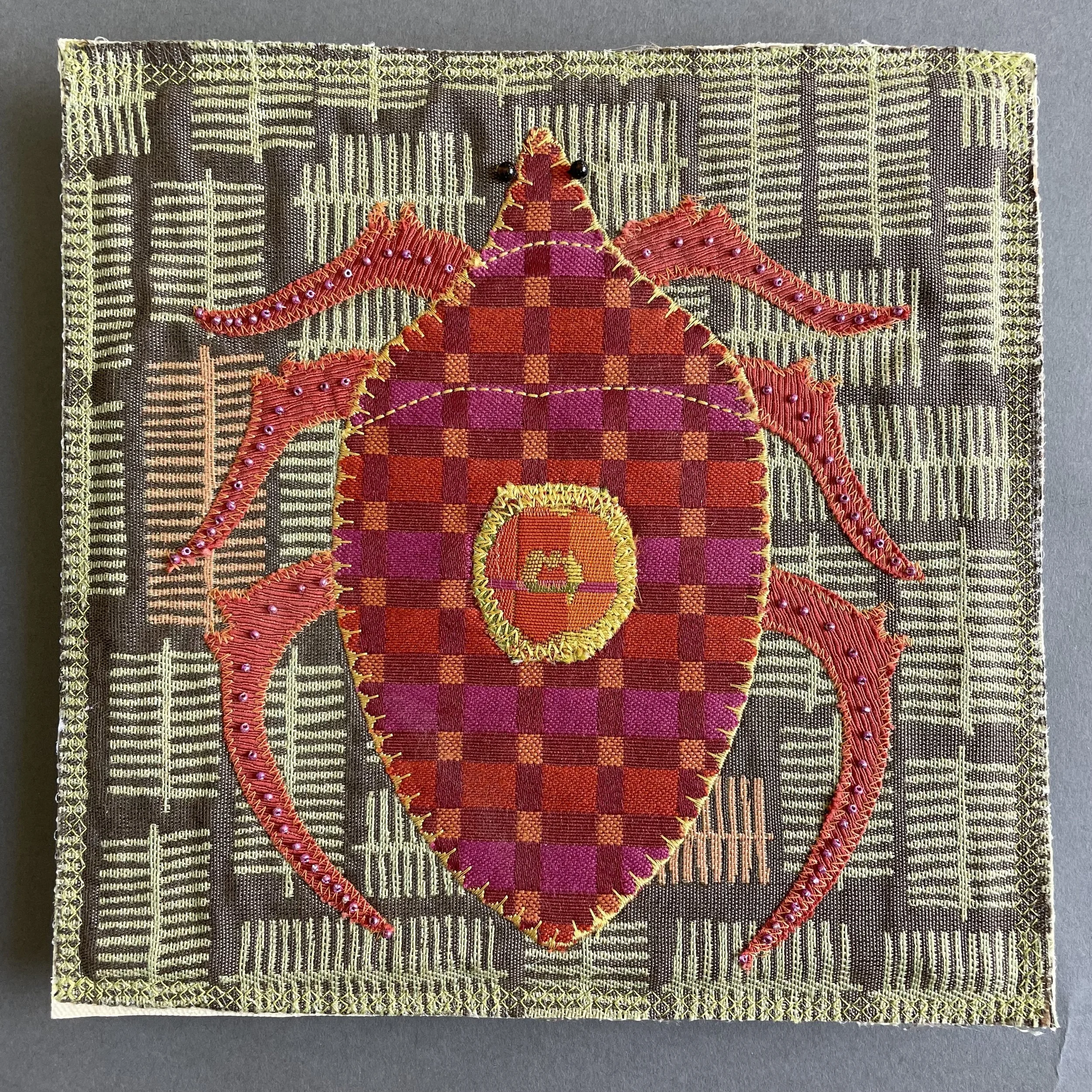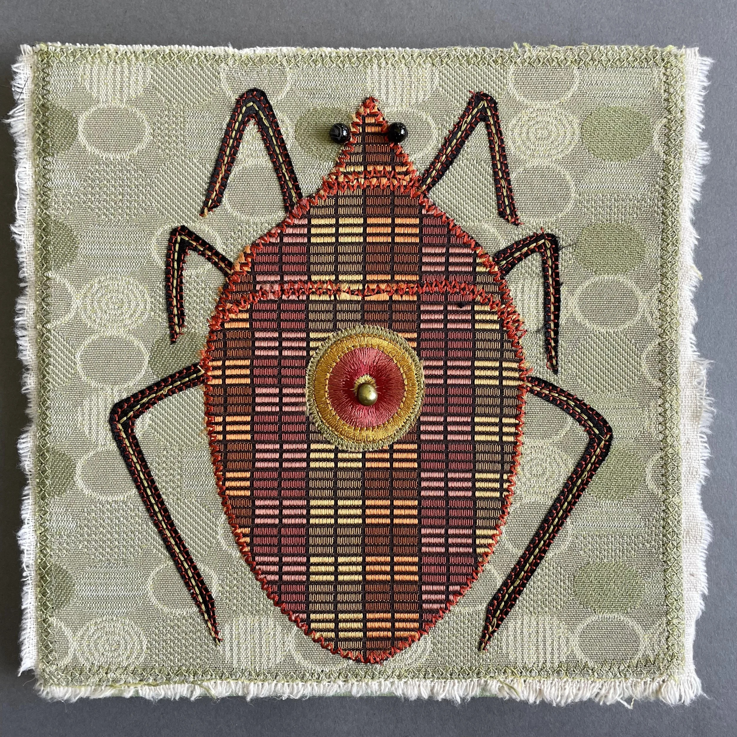 Designer Bug #14, 8”X8”, machine stitched using designer fabric swatches and embellished with beads. Sold