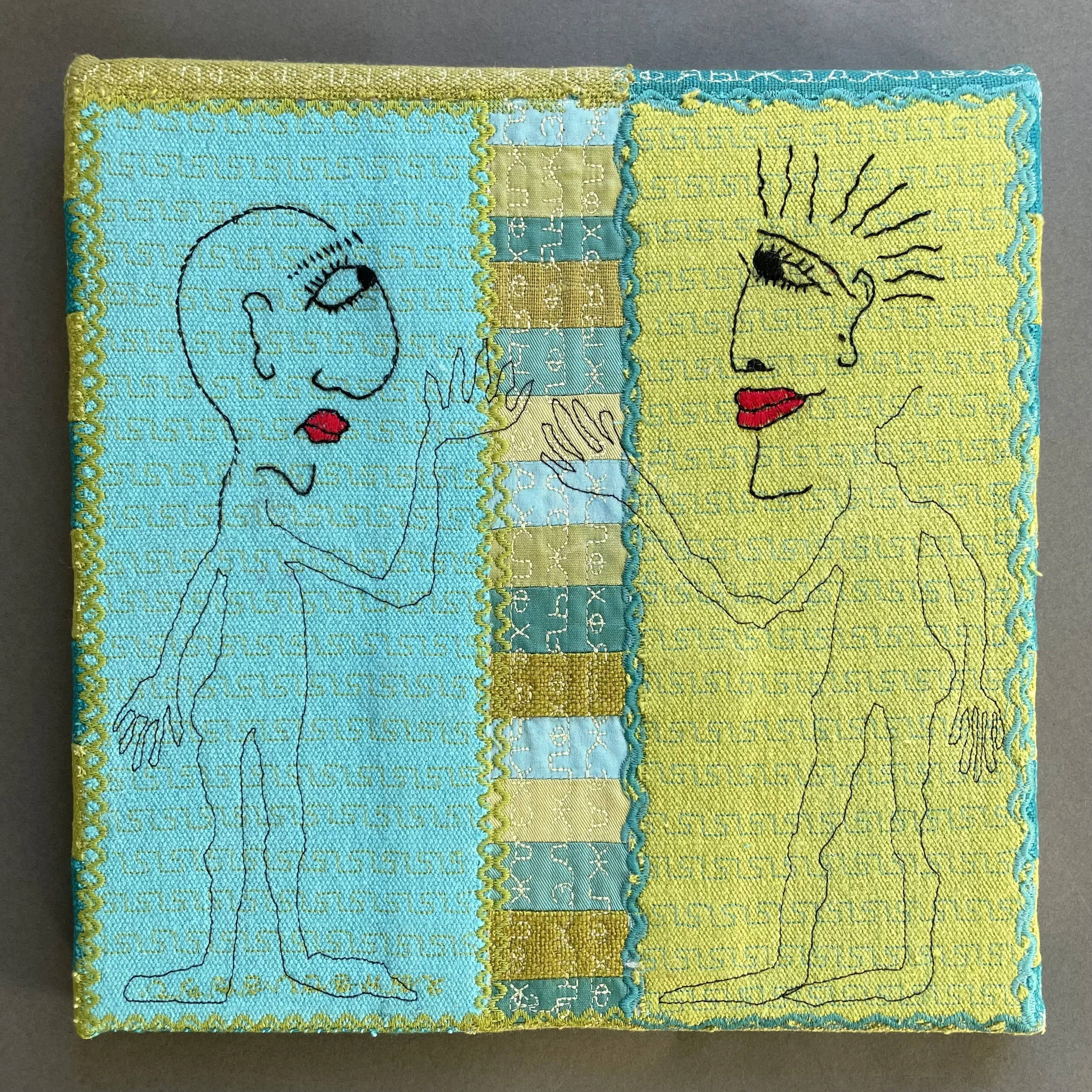 We should talk: We have a lot in common, 10”X10”, machine stitched using designer fabric swatches. Sold