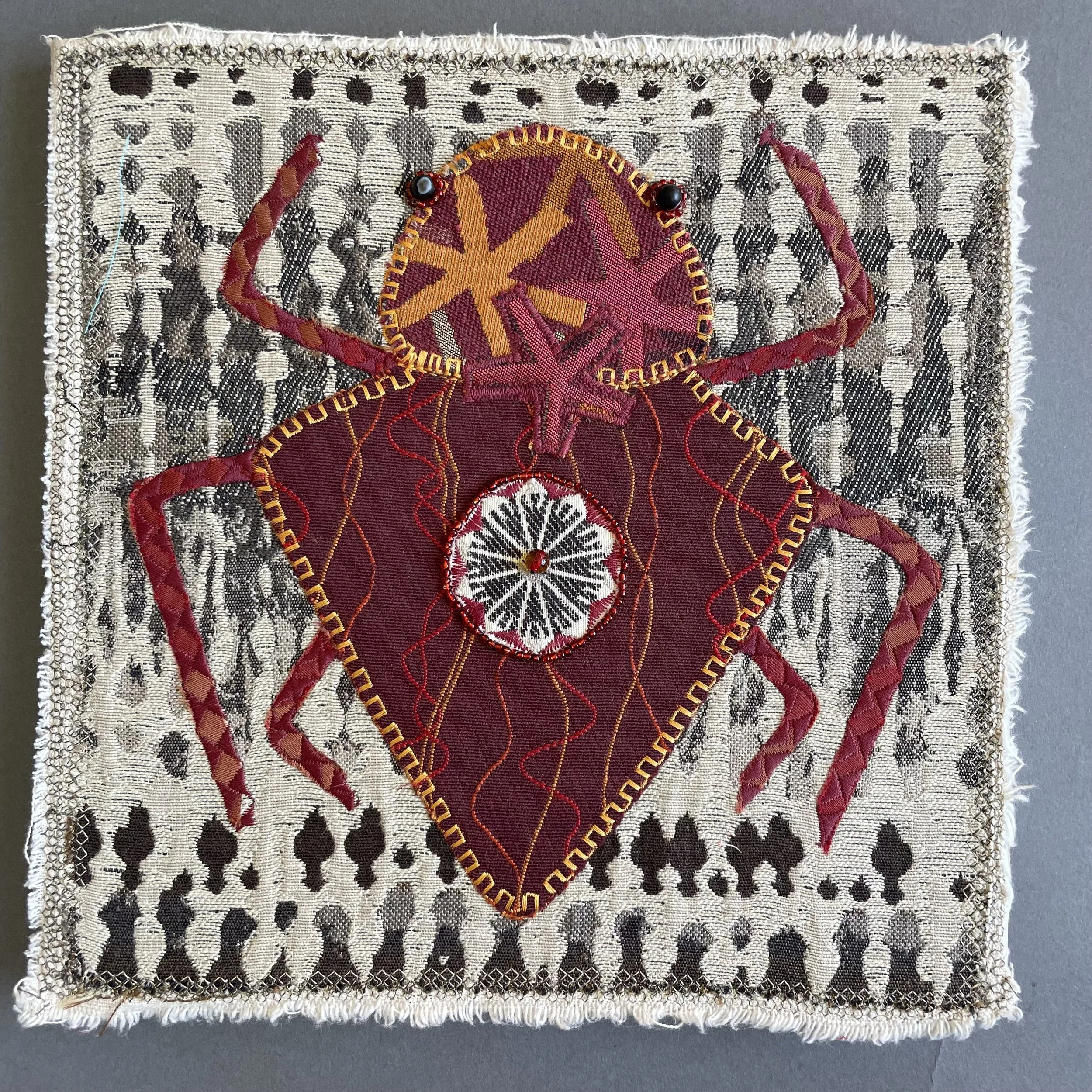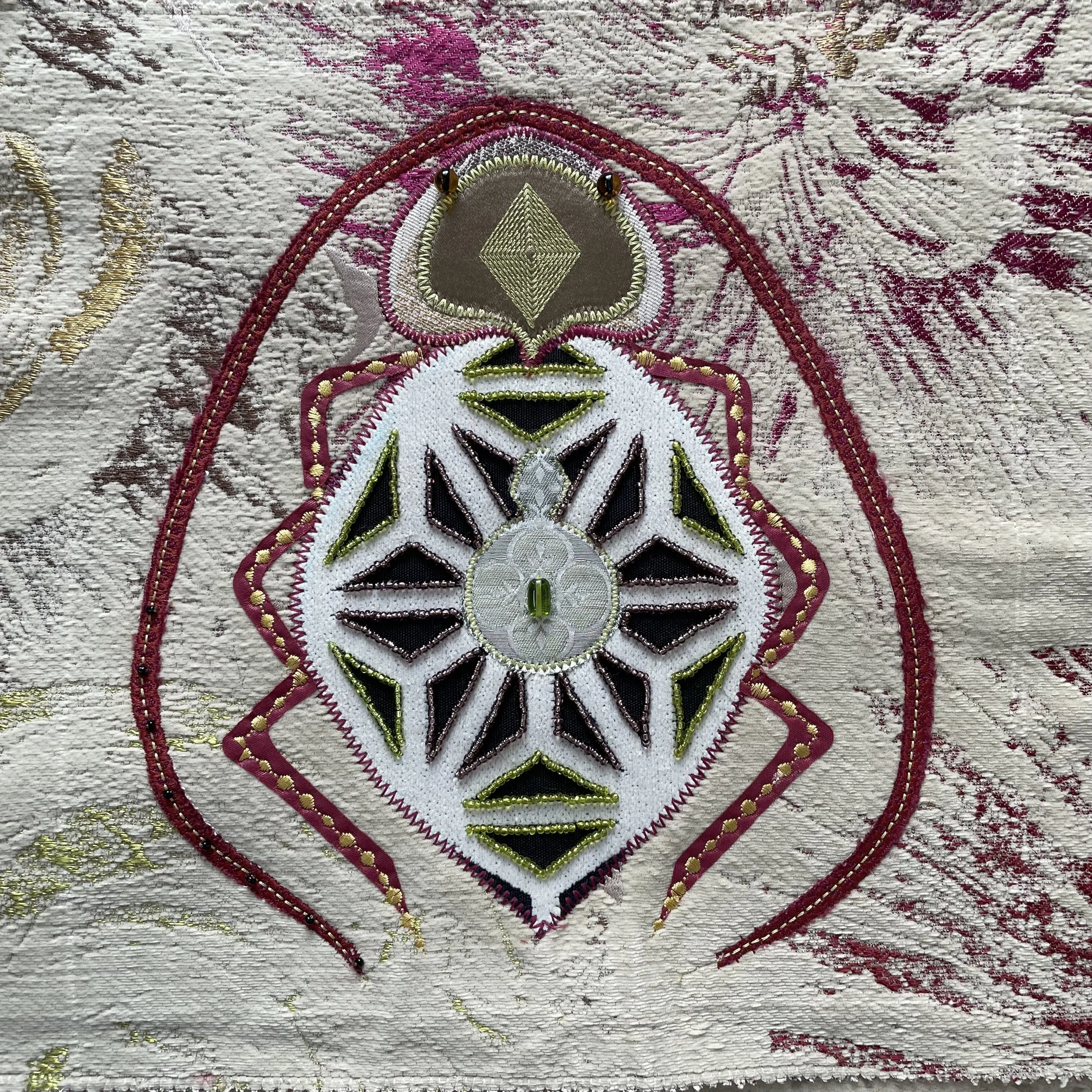 Designer Bug #7, 10”X10”, machine stitched using designer fabric swatches and embellished with beads. Sold