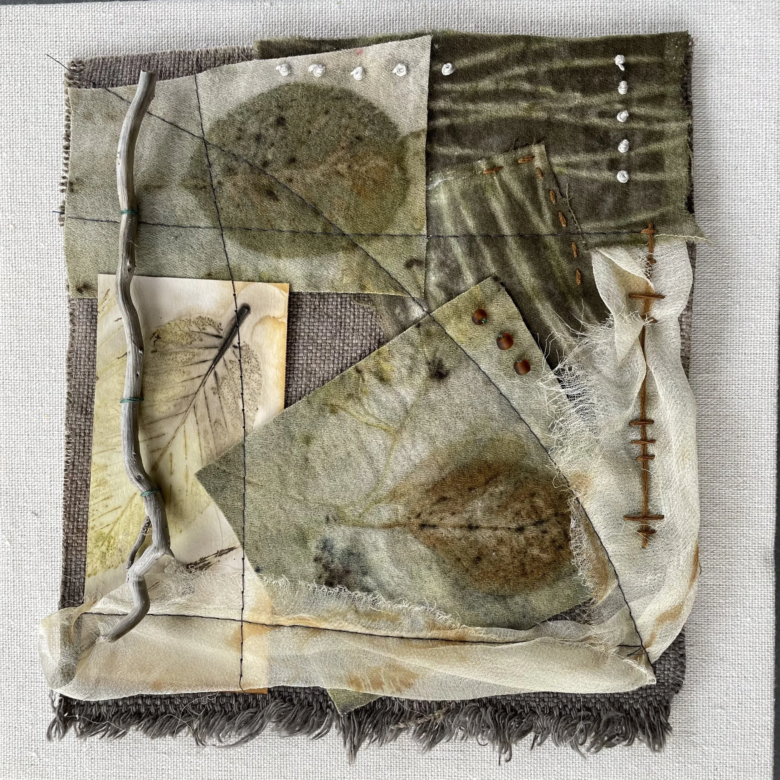 Eco prints on wool, silk and paper with with driftwood, machine and hand stitched. 8” X 12”.