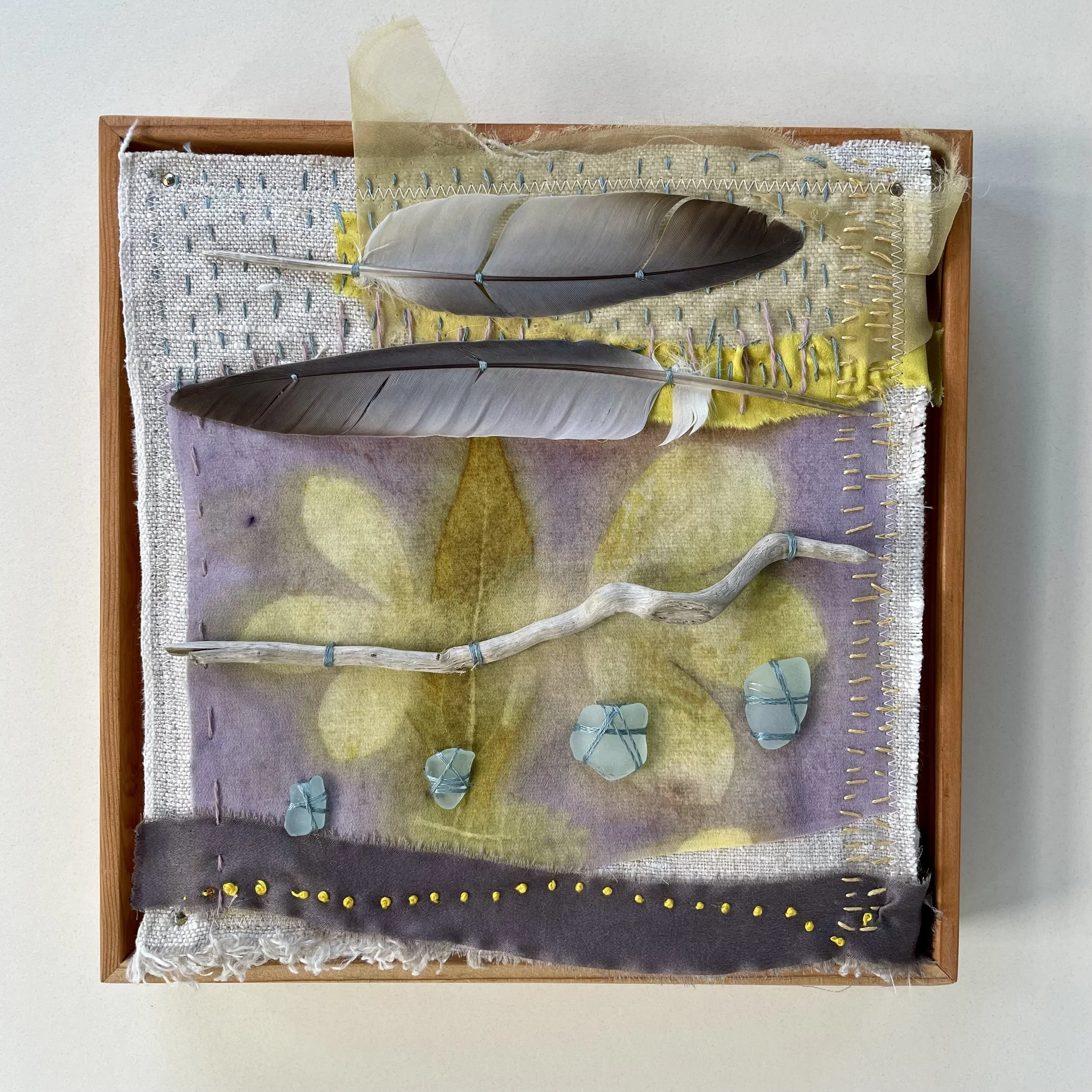Natural dyed and eco printed silk with sea glass, feathers, a stick, and hand stitched. 8” X 12”.